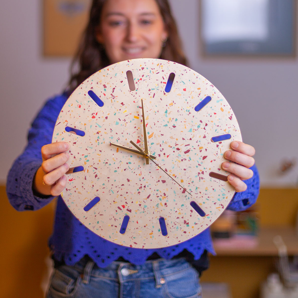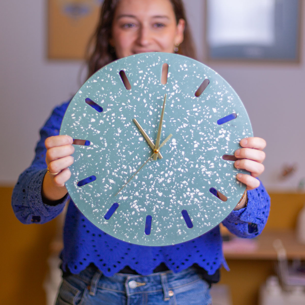 Tijdens deze creatieve workshop duiken we in de wereld van terrazzo en ontwerp je van begin tot eind je eigen wandklok (diameter 32cm).
